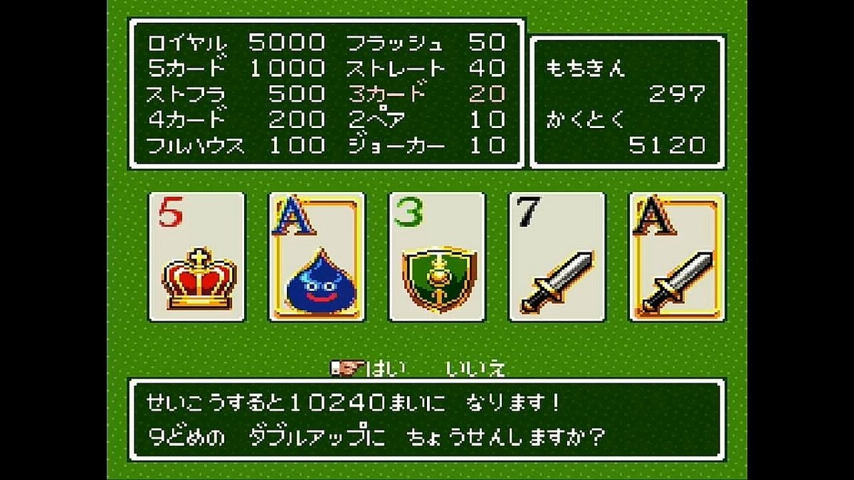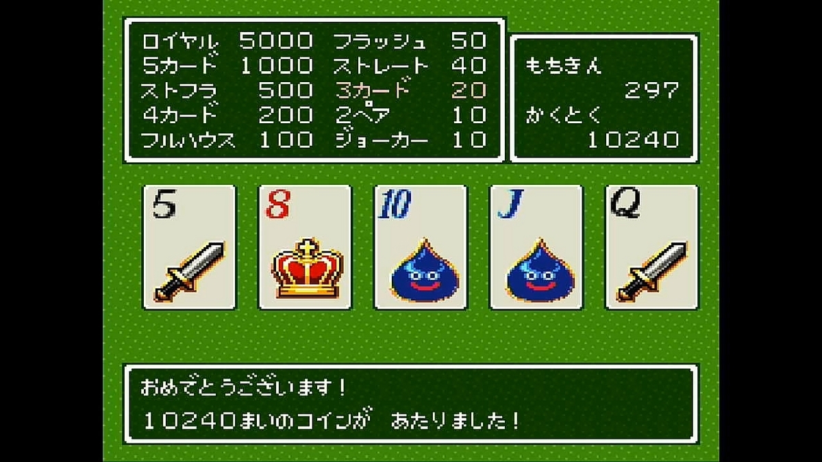 最高5コイン賭けれるんですが、たまに揃ってもスライムなので10コイン程度しか入ってこないんです。負け分を考えるとコスパが悪いです。